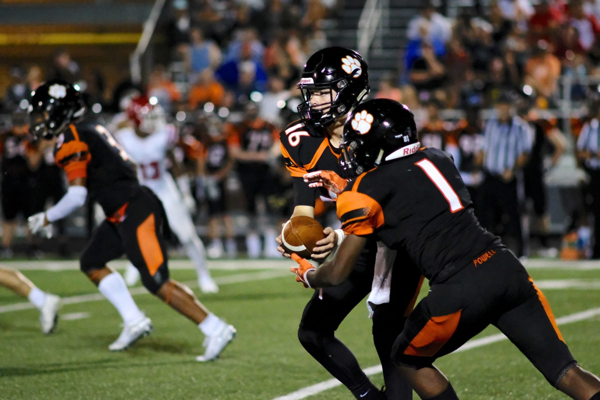 - Powell’s Walker Trusley (16) hands the ball to Fernando Frances (1) during their game against Halls on Friday, August 17, 2018 at Powell.