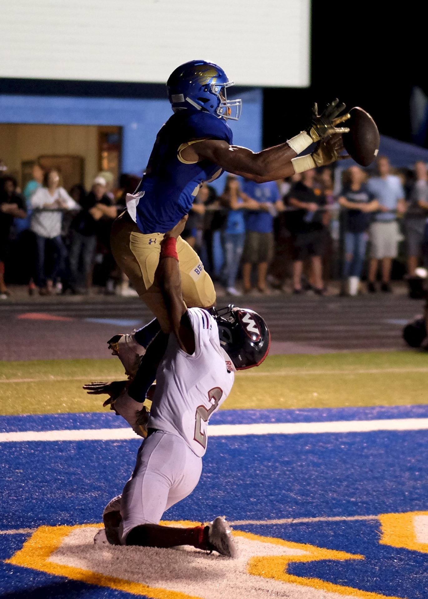 - Karns’ Thomas Harper (10) bobbles a pass after West’s Xavier Davis (2) is called for pass interference on Friday, August 31, 2018 at Karns.
